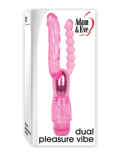 Fulfill all your wickedest double penetration fantasies with this sizzling hot double penetration vibrator! The Adam and Eve Dual Pleasure Vibe thrills in front with a realistic 4.75″ (12.07 cm) shaft, while in the back, a separate 4.5″ (11.43 cm) string of six firm anal beads massages your deepest backdoor hot spots. Powerful multi-speed vibrations buzz from the centrally-located motor. The perfect toy for the DP curious!