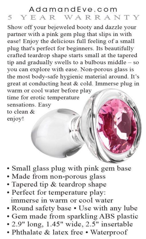 Show off your bejeweled booty and dazzle your partner with a pink gem plug that slips in with ease! Enjoy the delicious full feeling of a small plug that’s perfect for beginners. Its beautifully crafted teardrop shape starts small at the tapered tip and gradually swells to a bulbous middle so you can explore with ease. Non-porous glass is the most body-safe hygienic material around. It’s great at conducting heat and cold. Immerse plug in warm or cool water before play time for erotic temperature sensation. Easy to clean and enjoy!