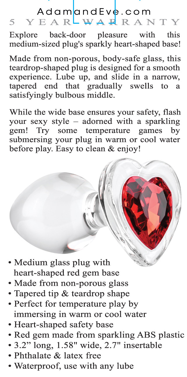 Explore back door pleasure with this medium-sized plug’s sparkly heart-shaped base! Made from non-porous, body-safe glass, this teardrop-shaped plug is designed for a smooth experience. Lube up, and slide in a narrow, tapered end that gradually swells to satisfyingly bulbous middle.