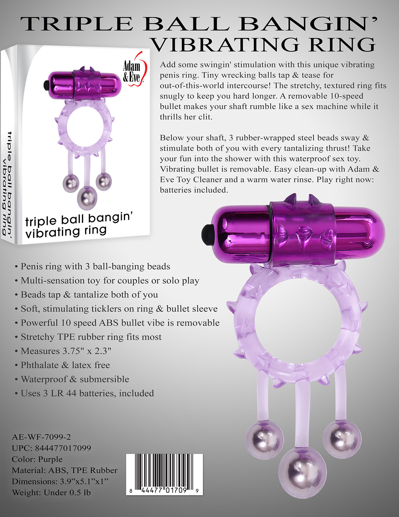 Add some swingin’ stimulation with this unique vibrating penis ring. Tiny wrecking balls tap and tease for out-of-this-world intercourse! The stretchy, textured ring fits snugly to keep you hard longer. A removable 10-speed bullet makes your shaft rumble like a sex machine while it thrills her clit.